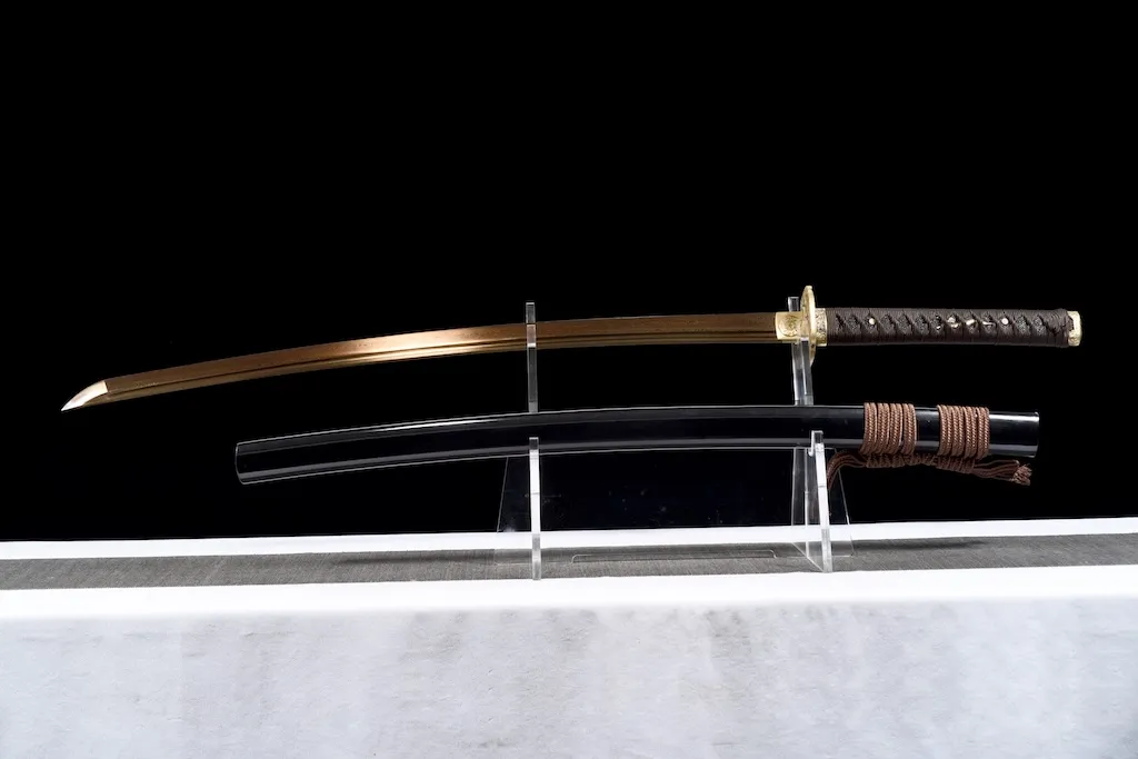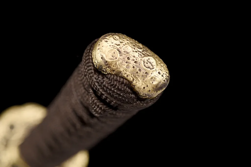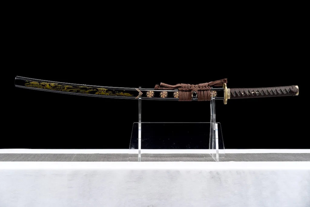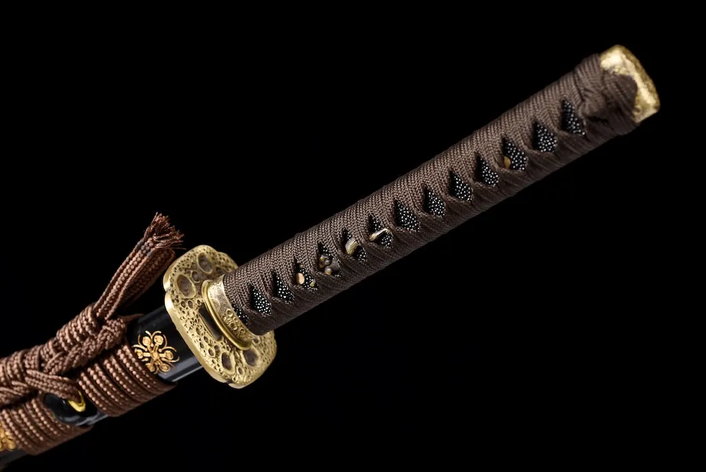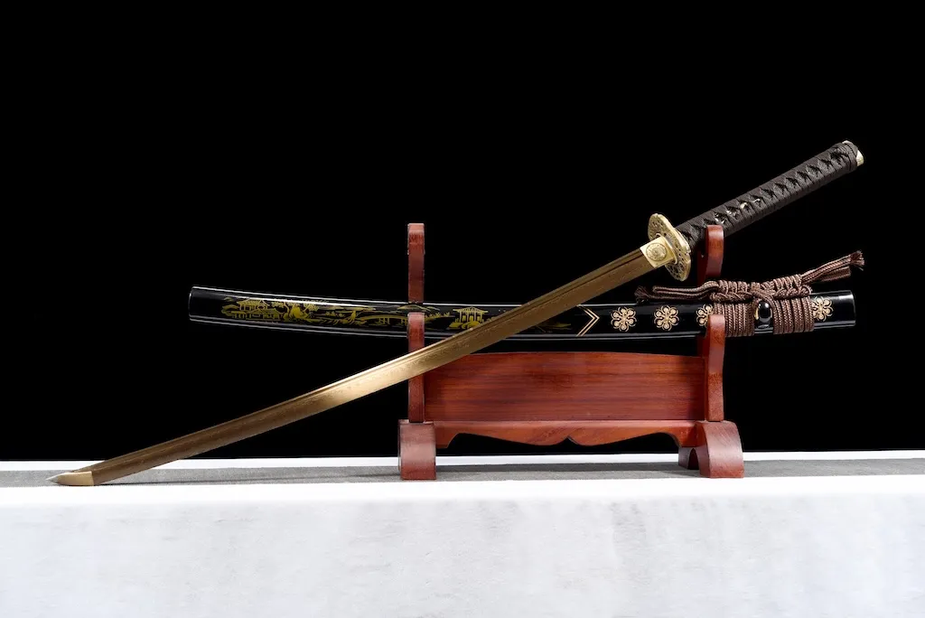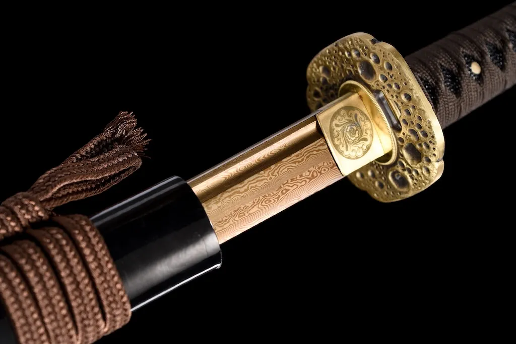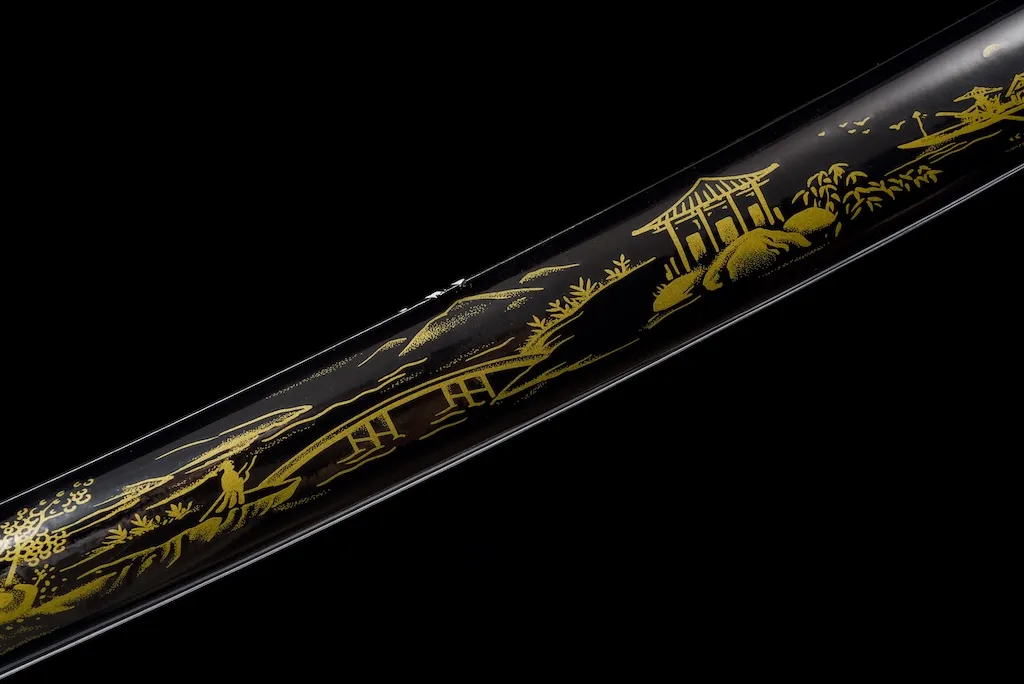 The saya is made from dense Ipe hardwood and finished with a glossy black lacquer. Decorative applique carvings add dimensional detail, creating a striking contrast against the golden blade and enhancing its ceremonial elegance.