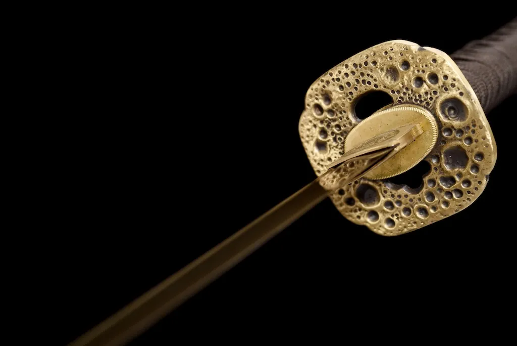 All fittings are crafted from solid copper and finished with a distinctive meteorite-inspired surface texture. From the tsuba to the fuchi, kashira, seppa, and the hand-engraved habaki, every component reflects premium materials and traditional craftsmanship.