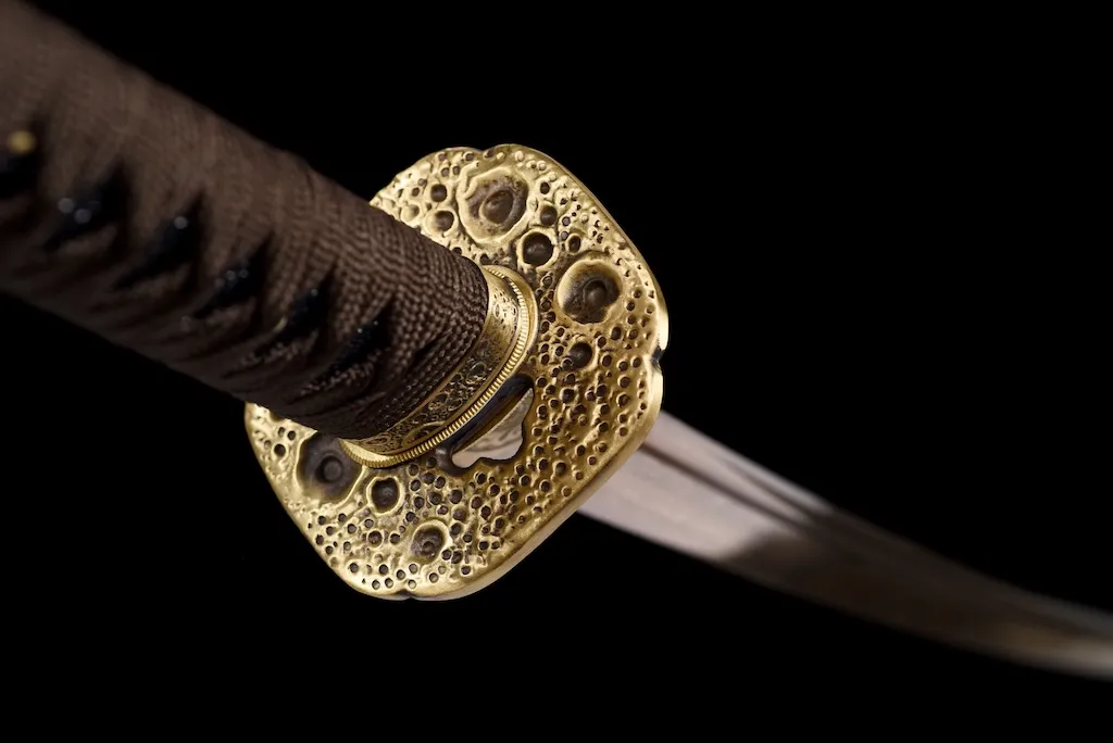 This katana is inspired by Amaterasu, the sun goddess of Japanese mythology. Featuring a radiant gold-tempered Damascus steel blade and solid copper mountings with a meteorite-like texture, it combines commanding visual presence with refined cutting performance.
