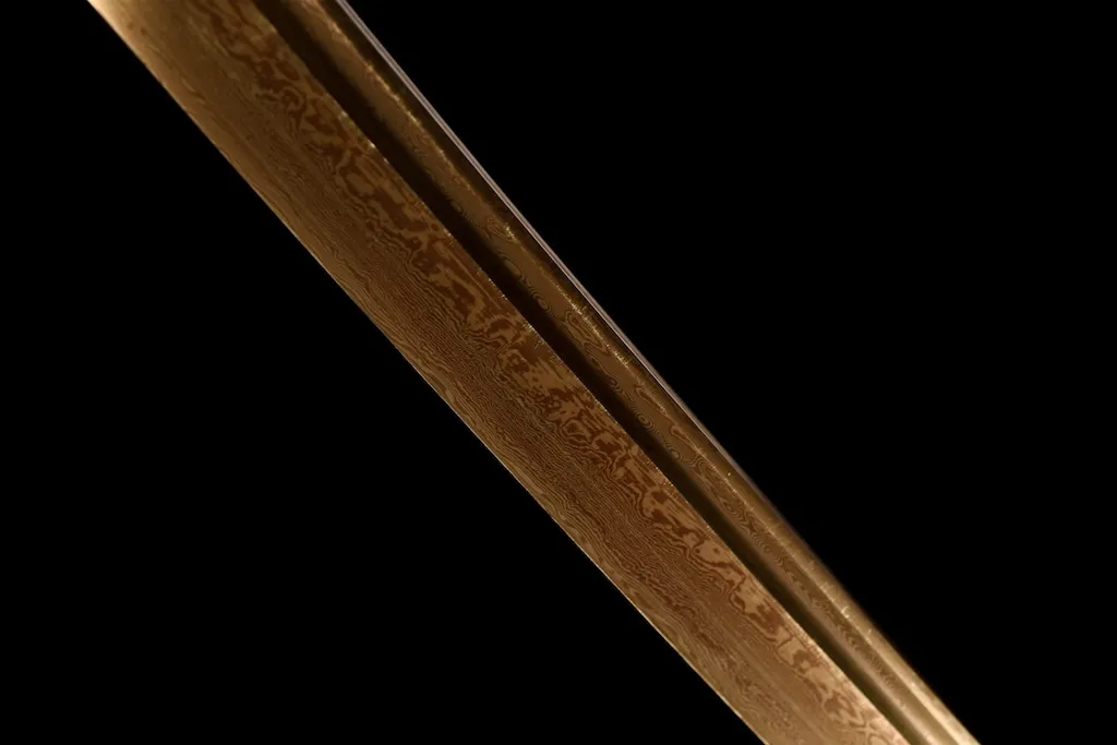 The blade is hand-forged from multi-folded Damascus steel, then finished with a high-temperature gold tempering process that produces a luminous golden hue.